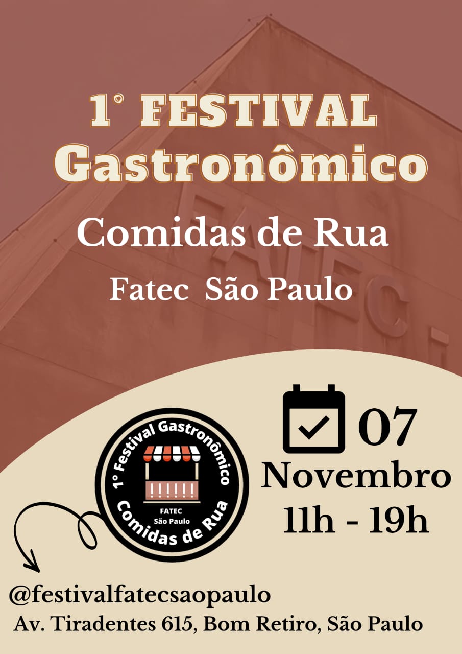 Convidamos a todos para o 1º Festival Gastronômico Comidas de Rua da Fatec São Paulo, evento organizado pelos alunos do 2º semestre do curso de Gestão de Empreendimentos Gastronômicos. O evento acontecerá no dia 07 de novembro, das 11h às 19h, nas dependências do campus